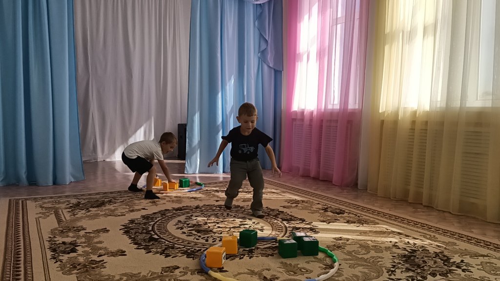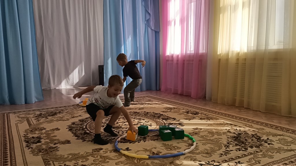Мектепалды даярлық тобы құрсаумен белсенді ойындар ойнады. Балалар блоктарды шеңберден құрсауға барынша жылдам ауыстырды, бастарына себетті ұстап тұрып шарларды жинады және бір ойыншыдан екінші ойыншыға арқан бойымен шеңберді сүйреп апарды. Барлық жаттығулар ептілікті, үйлестіруді, зейінді және топтық жұмысты дамытуға көмектесті.