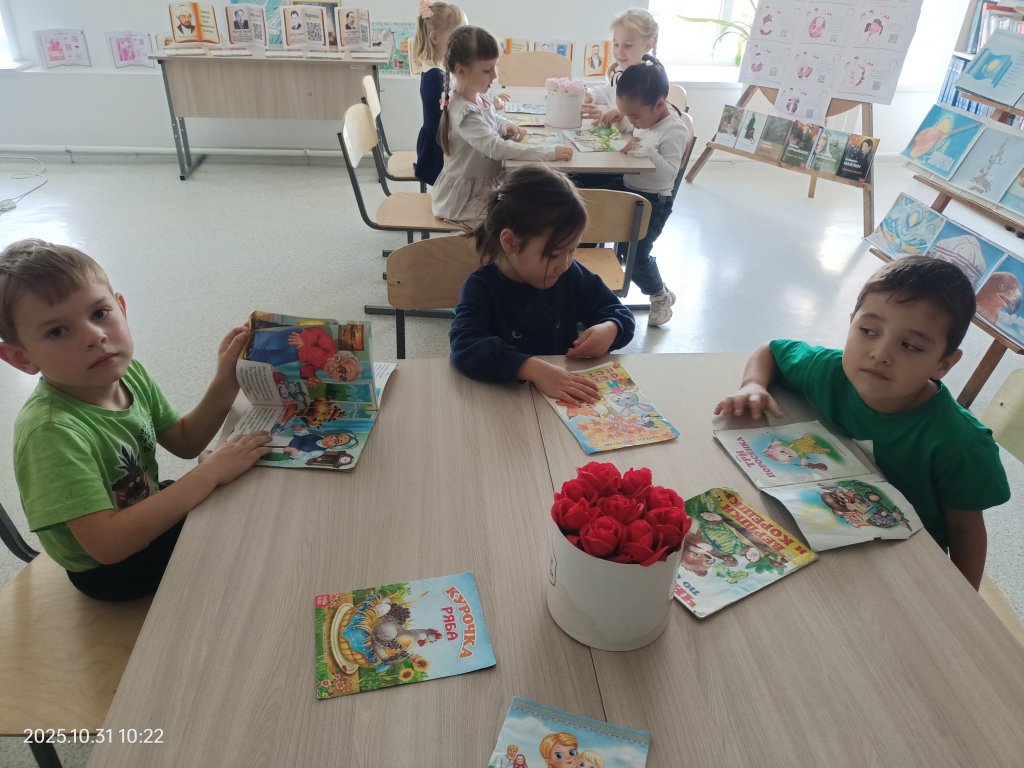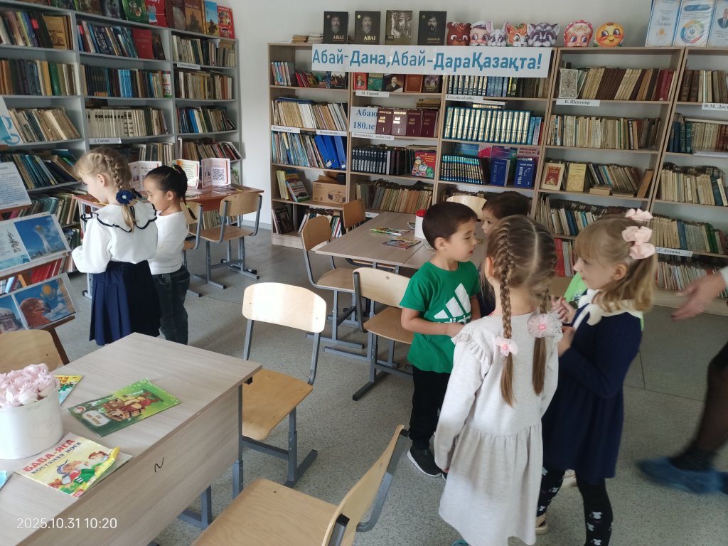 Осыдан кейін топ кітапхана орналасқан екінші қабатқа көтерілді. Балаларға балалар кітаптары көрсетіліп, әдебиетті үйге қалай алуға болатындығы айтылды.