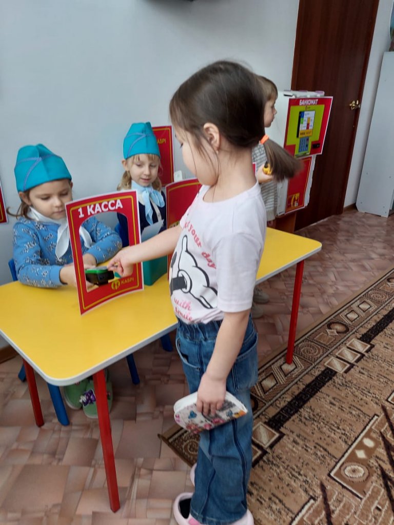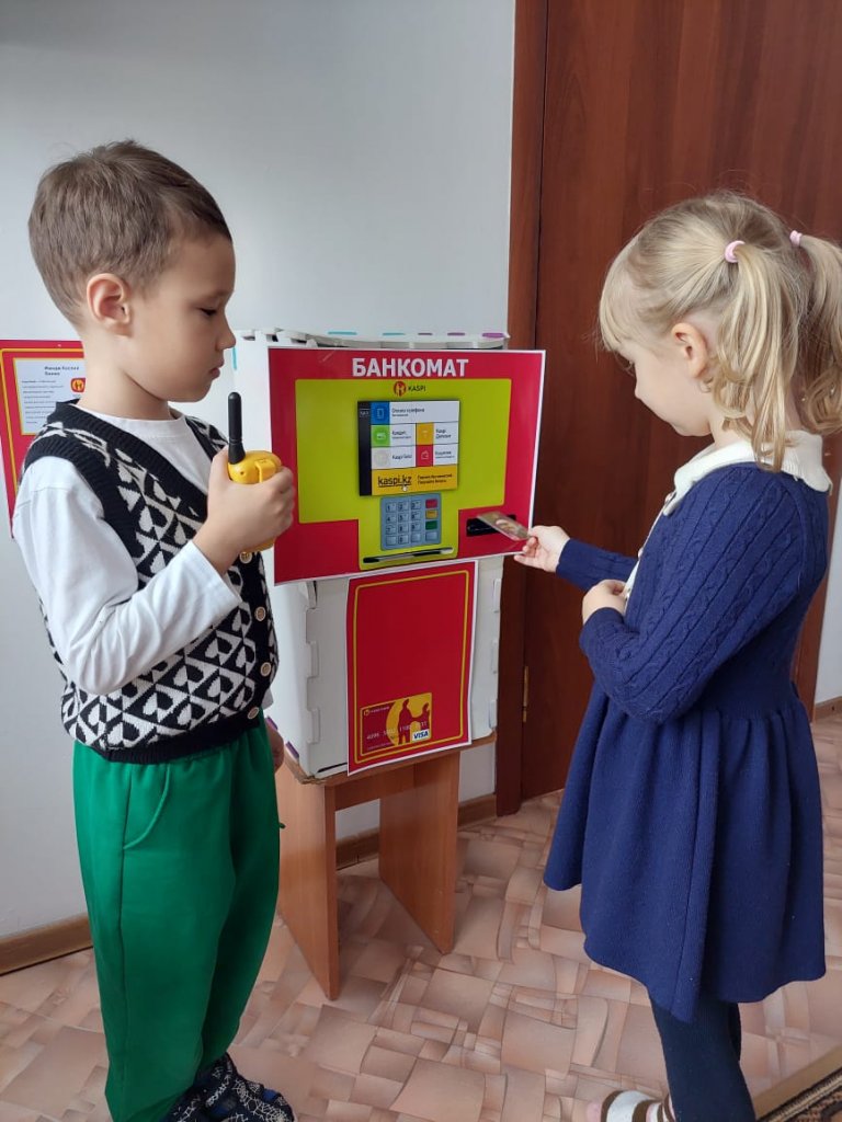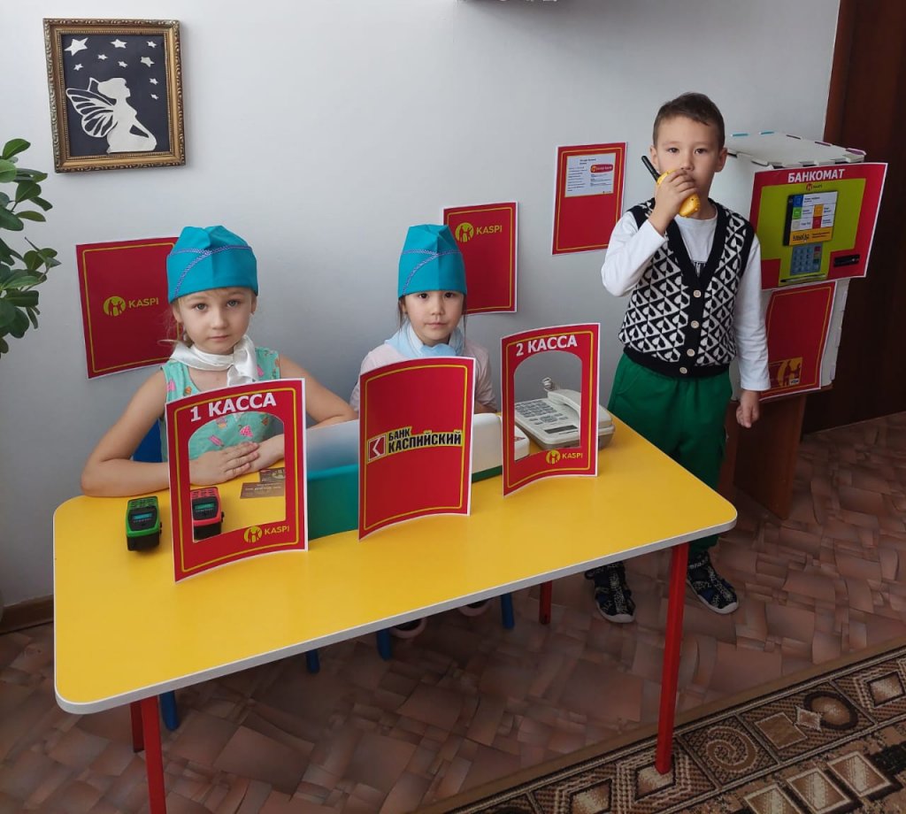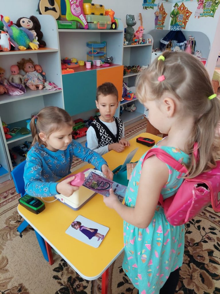 Сабақ барысында балалар «Банкке бару» жағдайын ойнады.
